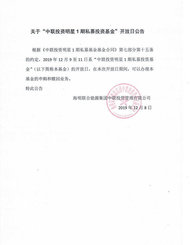 关于“中联投资明星1期私募投资基金”开放日公告12.9-11日